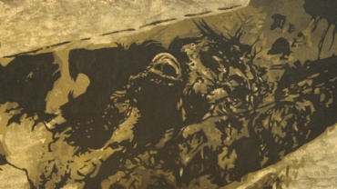 The painting portrays 3 images of the Alamo. In front, the Alamo is displayed as it looked around the time of the battle – referenced by an antique daguerreotype of the building in 1849. The middle layer shows the Alamo as we know it today…